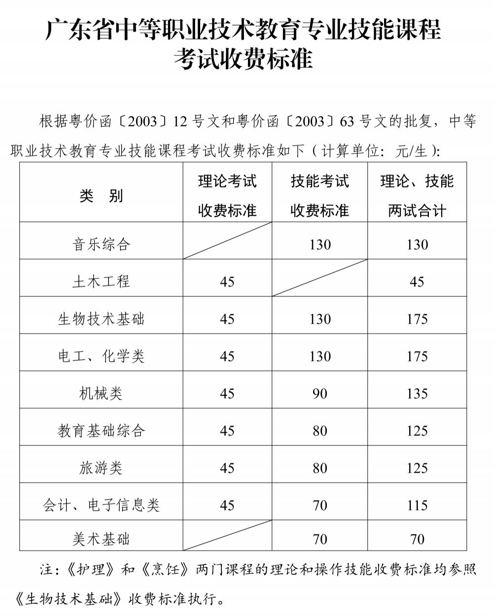 4.广东省中等职业技术教育专业技能课程考试报考收费标准