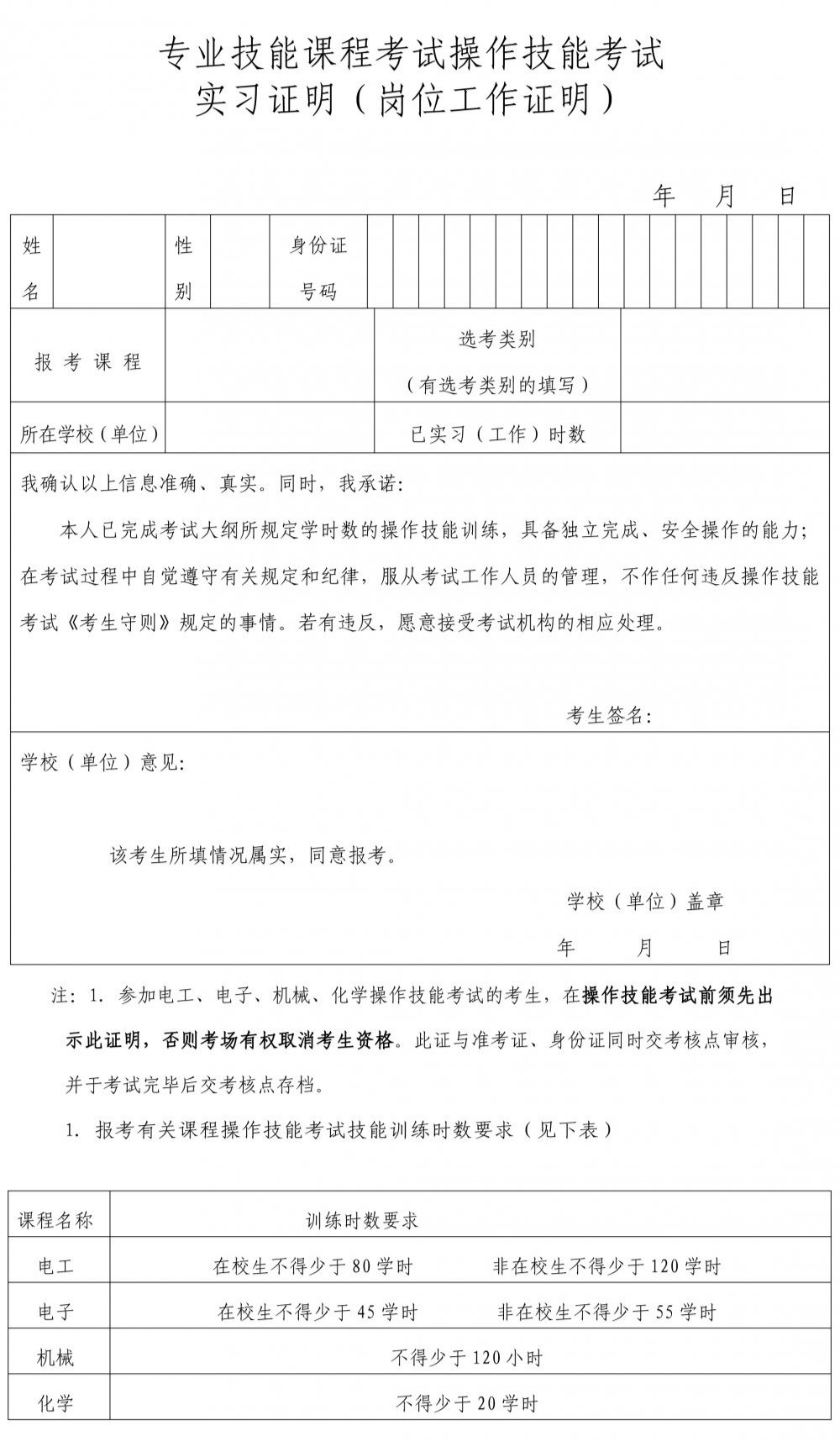 (四)报考《电工》《机械》《化学》操作技能考试的考生,在参加该科目操作技能考试时须出示学校(单位)开具的《专业技能课程考试操作技能考试实习证明(岗位工作证明)》(格式见附件3),否则将不予参加该科目操作技能考试。