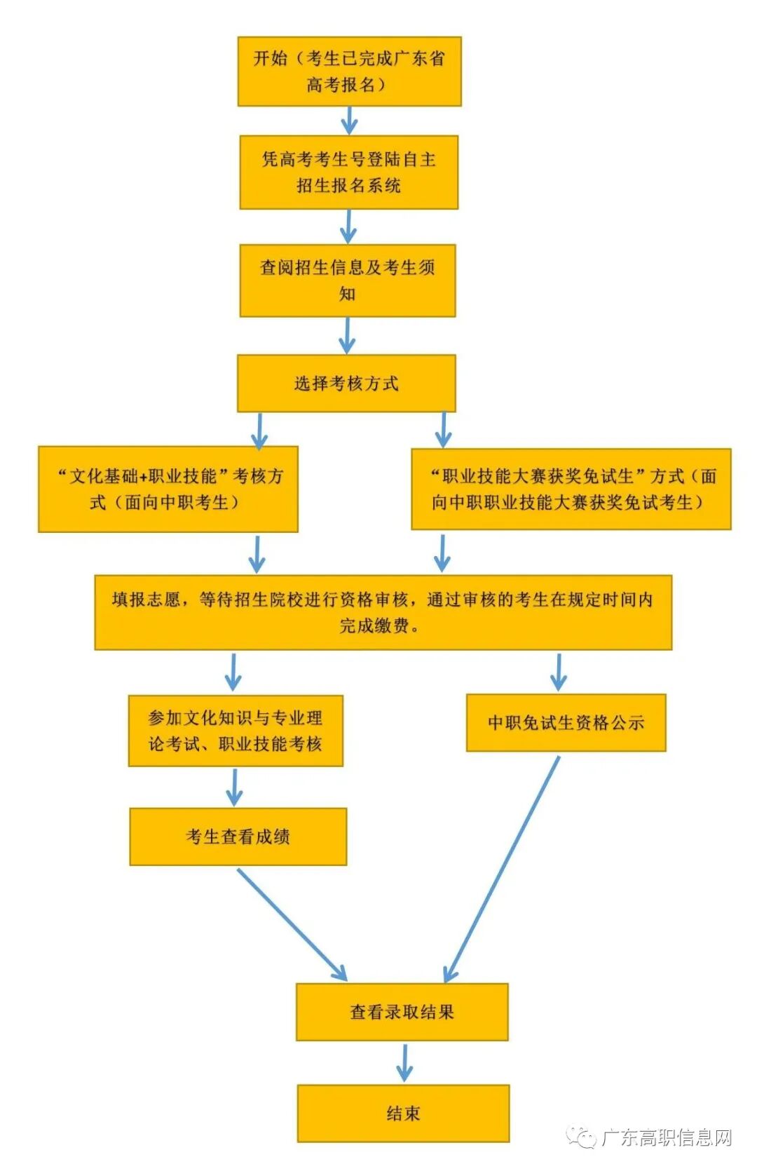 4月28日至5月1日,考生凭高考报名号及密码登录“广东省2021年高职院校自主招生网上报名系统”(下称网上报名系统,网址:https://pg.eeagd.com.cn/gzks)报名,签订《诚信考试承诺书》,选择“文化基础+职业技能”(面向中职考生)或“职业技能大赛获奖免试生”(面向中职考生)两种考核方式中一种填报志愿、缴交考试费,录入相关报名信息、上传有关证明材料(原件扫描版, 下同)。经招生院校确认报考资格后,考生不得更改考核方式。考生报考流程图详见下图。
