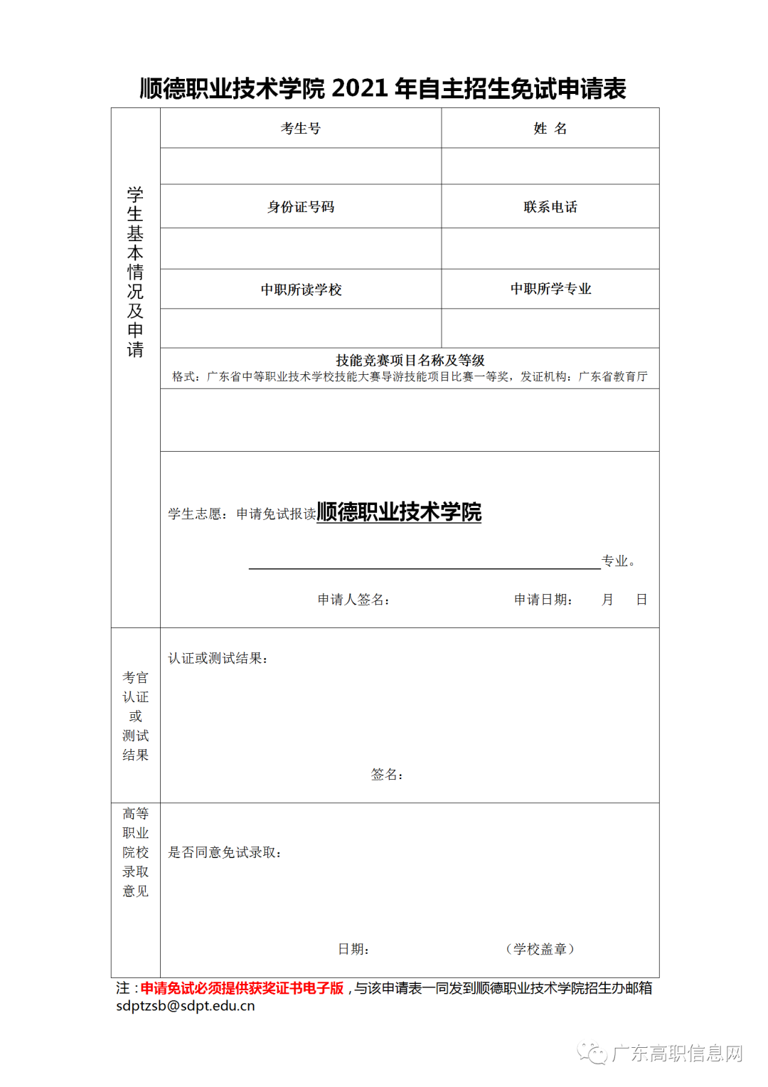 免试生需在4月28日至5月1日,凭高考报名号及密码登录“广东省2021年高职院校自主招生网上报名系统”(下称网上报名系统,网址:https://pg.eeagd.com.cn/gzks)报名,签订《诚信考试 承诺书》,选择“职业技能大赛获奖免试生”(面向中职考生)考核方式填报志愿、缴交考试费,录入相关报名信息、上传有关证明材料(原件扫描版)。并下载本通知《附件1:顺德职业技术学院2021年自主招生免试申请表》,请将该表填写完全并连带相关证书扫描件(原件扫描版)于报名系统关闭前发送邮件至邮箱:sdptzsb@sdpt.edu.cn,未在报名系统内报名或逾期发送邮件的不予受理。