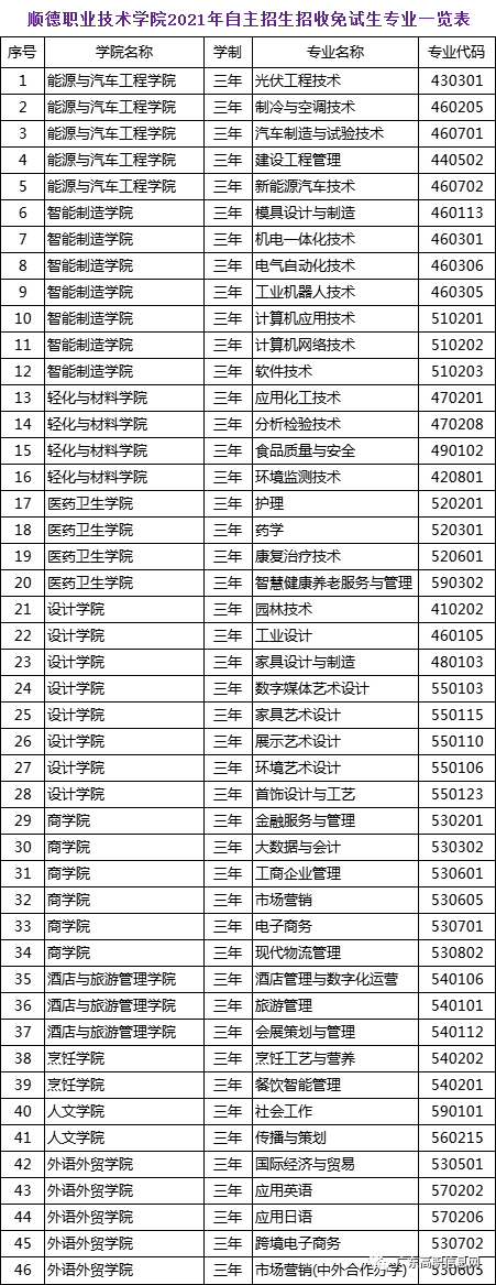 2.顺德职业技术学院2021年自主招生招收免试生专业一览表