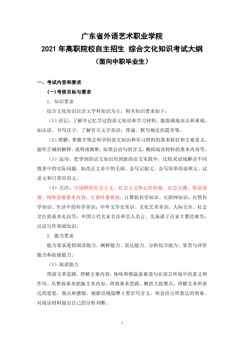 综合文化素质:广东省外语艺术职业学院2021年高职院校自主招生(面向中职)综合文化知识考试大纲(所有报考我校考生都要考的)