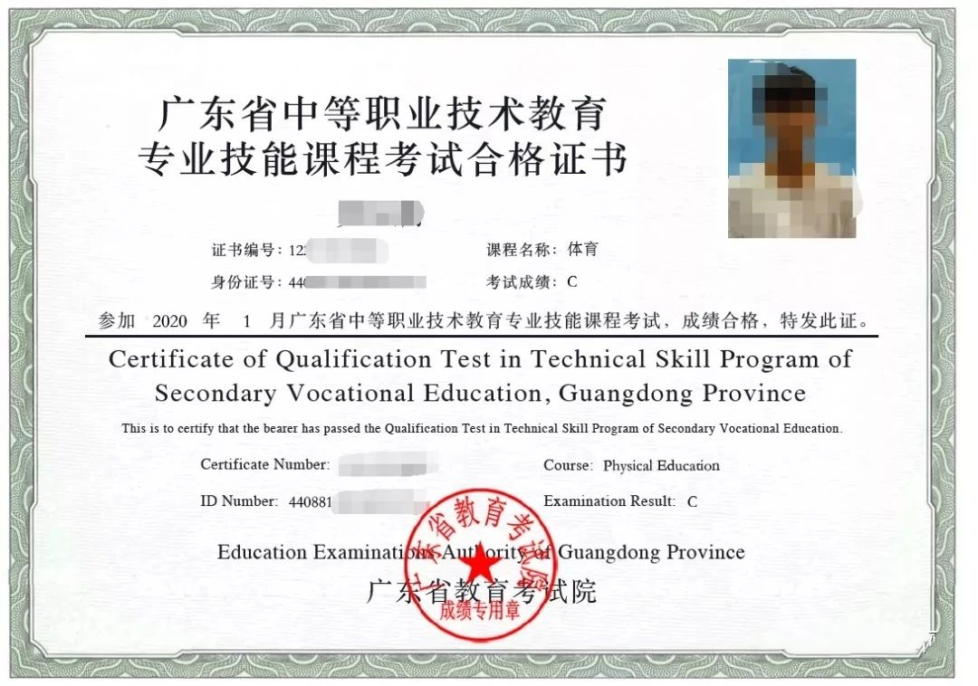 我院不统一打印广东省中等职业技术教育专业技能课程考试合格证书。
