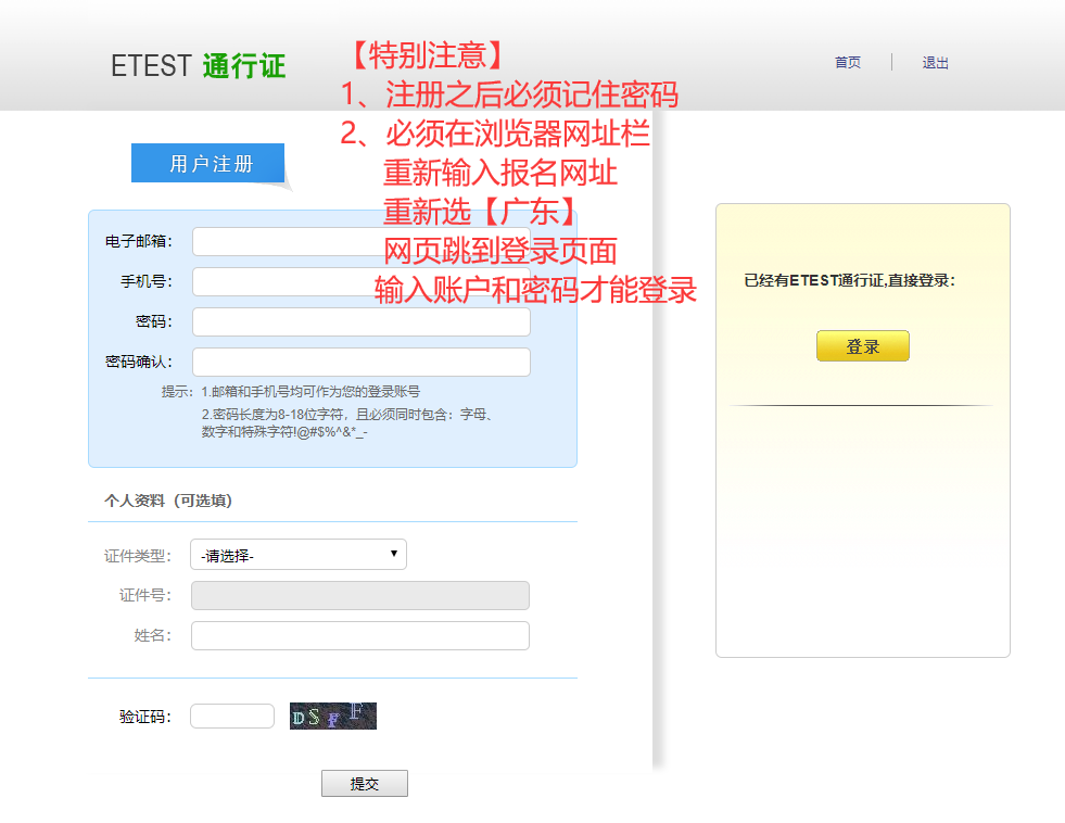 注册ETEST通行证(之前报过名,已有账号的跳过此步骤),首次报名的,可在正式报名之前注册好。报名快捷入口: