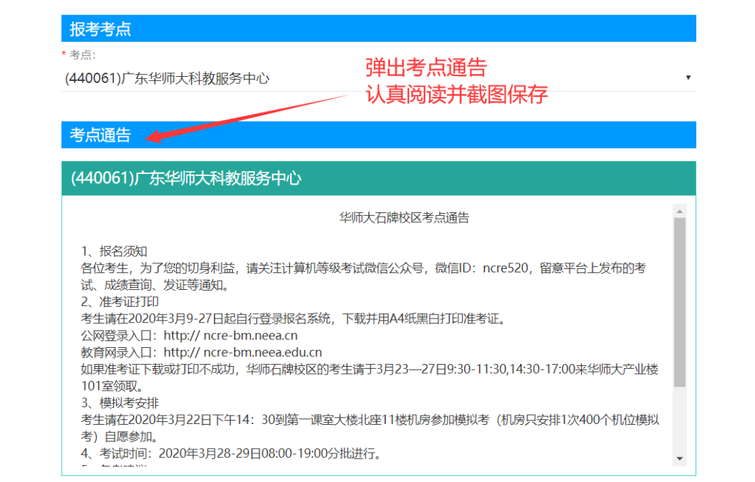 第十步:认真查看“考点通告信息”并截图保存(相当重要),如考点没有设置通告的忽略此步骤!