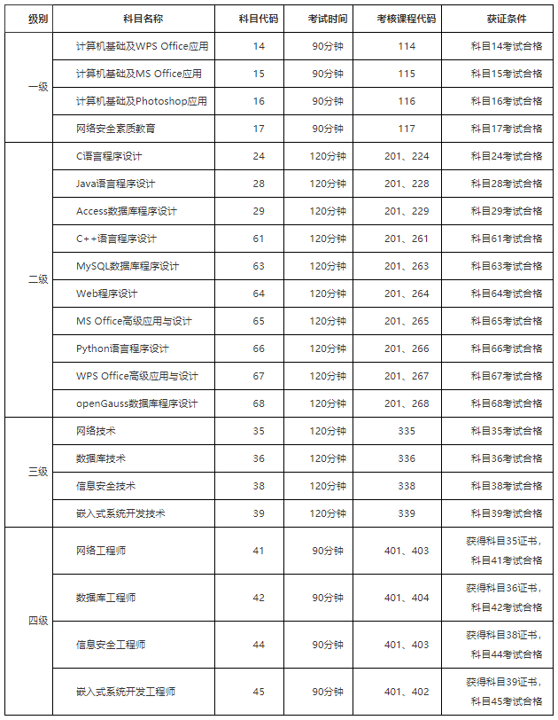 NCRE级别科目设置及证书体系