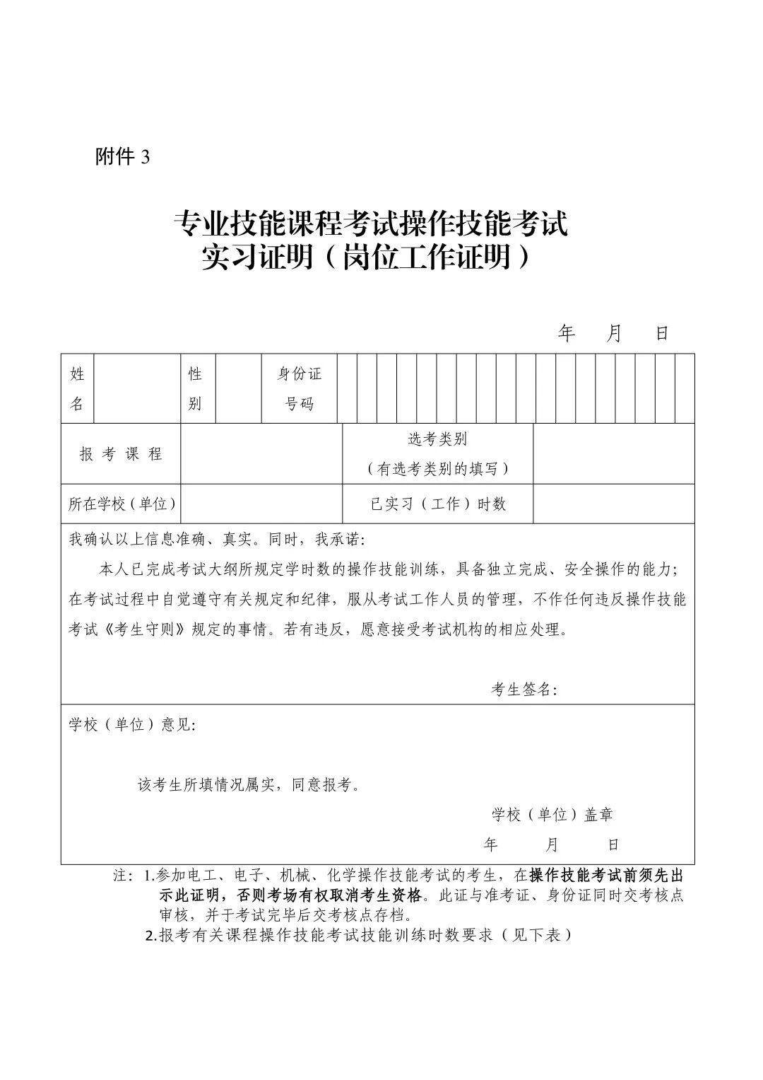(四)报考《电工》《机械》《化学》操作技能考试的考生,在参加该科目操作技能考试时须出示学校(单位)开具的《专业技能课程考试操作技能考试实习证明(岗位工作证明)》(格式见附件3),否则将不予参加该科目操作技能考试。