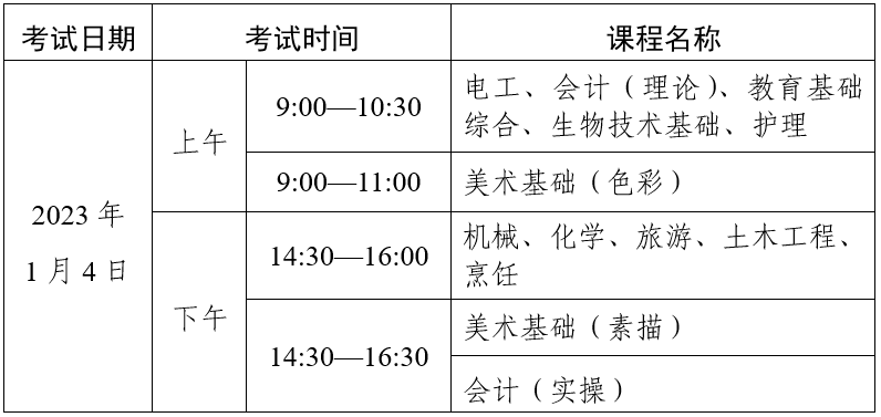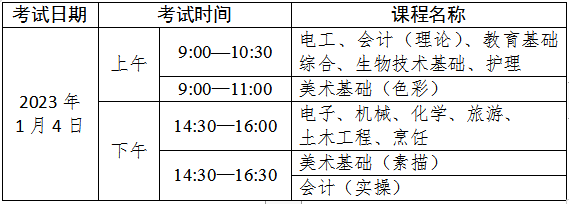 2.电工、机械、化学、教育基础综合(声乐、舞蹈、钢琴)、旅游、生物技术基础、护理、烹饪等课程的操作技能考试时间安排在2022年12月17日-18日进行(具体考试时间以准考证为准)。