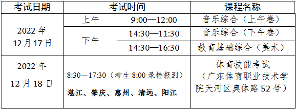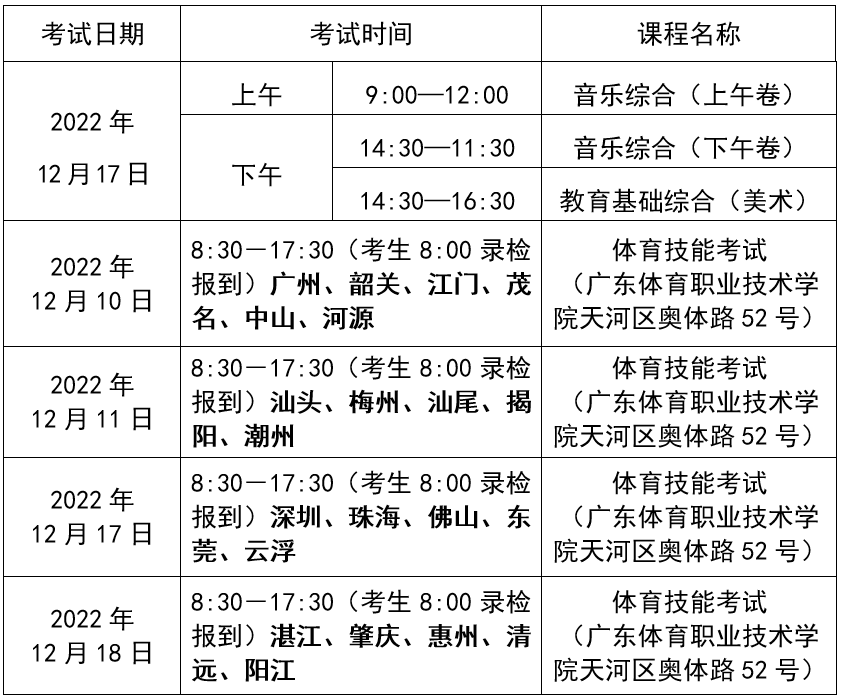 3. 《体育》考试全省统一安排在广东体育职业技术学院分地区进行,考生根据考点安排的分地区片区联系电话:020–61034014。