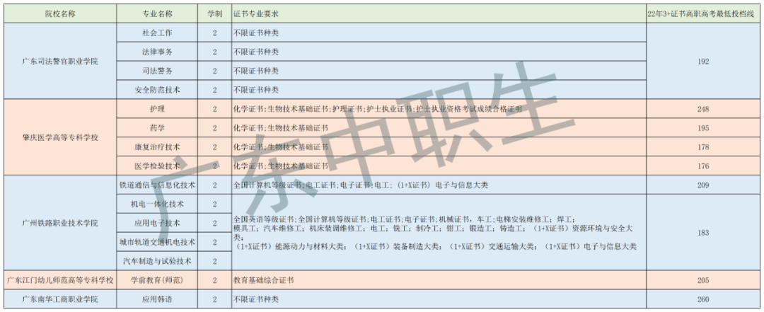 在2022年3+证书高职高考招生院校中,面向中职生招生的2年制大专院校有:广东司法警官职业学院、肇庆医学高等专科学校、广州铁路职业技术学院、广东江门幼儿师范高等专科学校、广东南华工商职业学院。