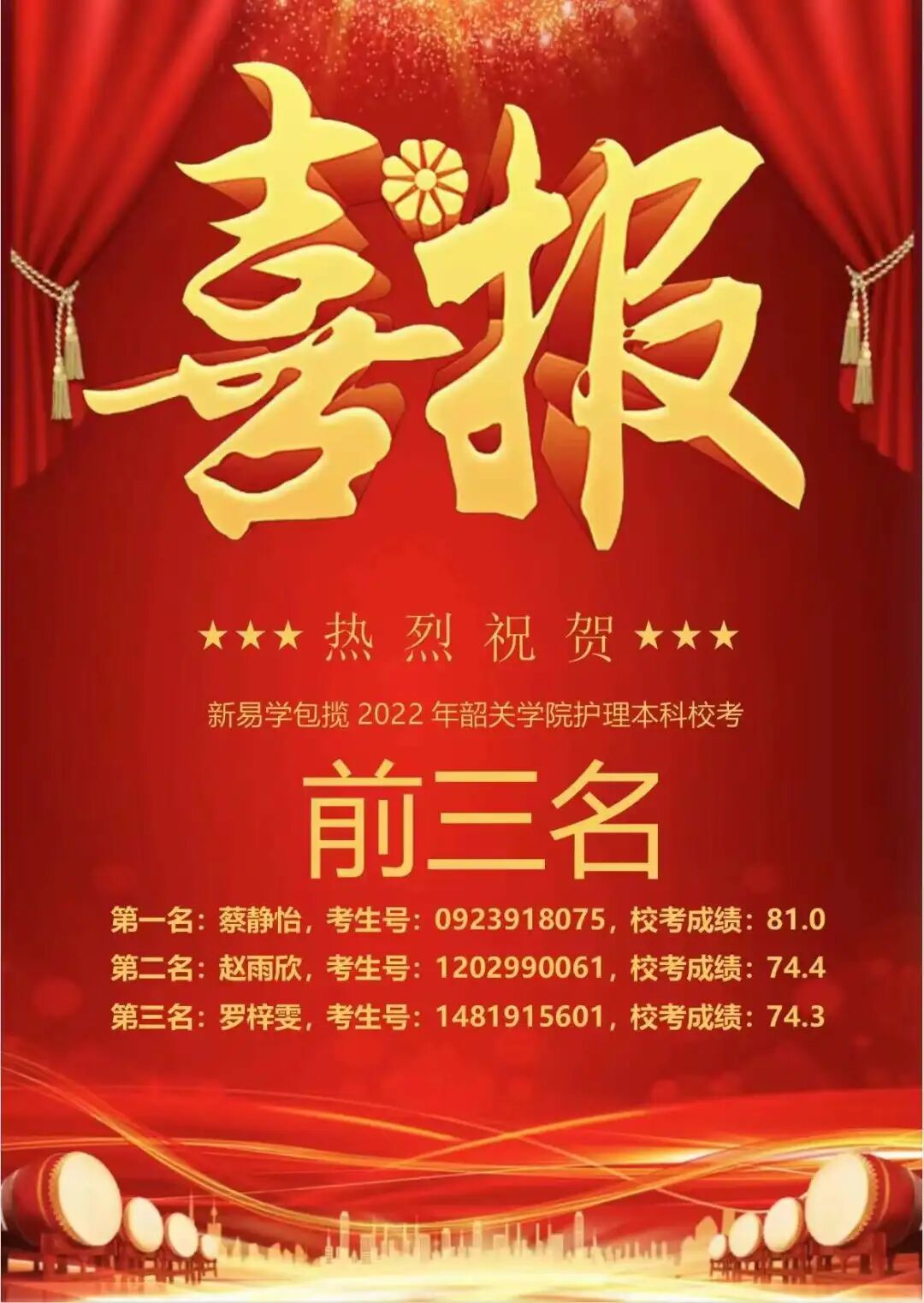 恭喜新易学学子包揽韶关护理本科校考前三名。这充分说明新易学本科校考培训班是完全专业并且有实力的!