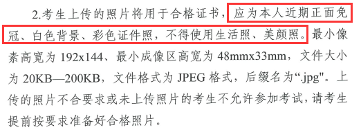 相片为考生本人近期正面免冠彩色证件照(白底),照片尺寸最小为192×144(高×宽),成像区大小为48mm×33mm(高×宽);照片格式为jpg,大小为20KB-200KB。