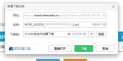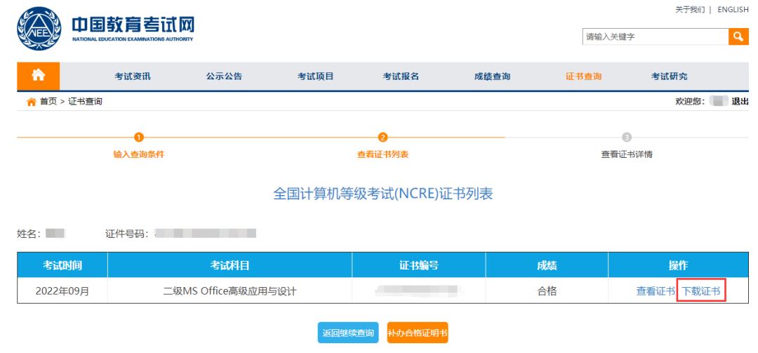 3、在证书列表内选择考试的批次,点击【下载证书】保存到电脑,如下图: