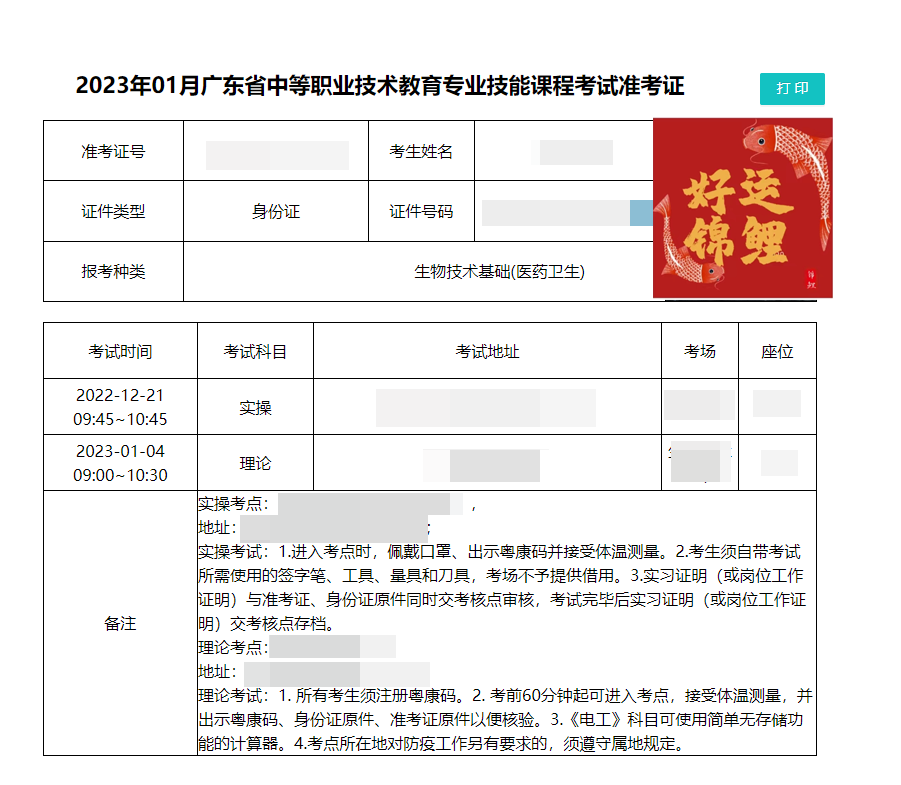 *2023年1月中职技能证书准考证实例