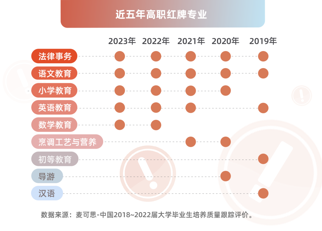 被列为近5年高职红牌专业次数最多的是法律事务、语文教育(均为5次),其次是小学教育、英语教育(4次)。