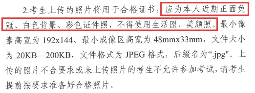 规格:彩色证件照(小一寸、20-200kb之内、格式jpg、电子照),要求白色底片。不能使用生活照或美颜照。