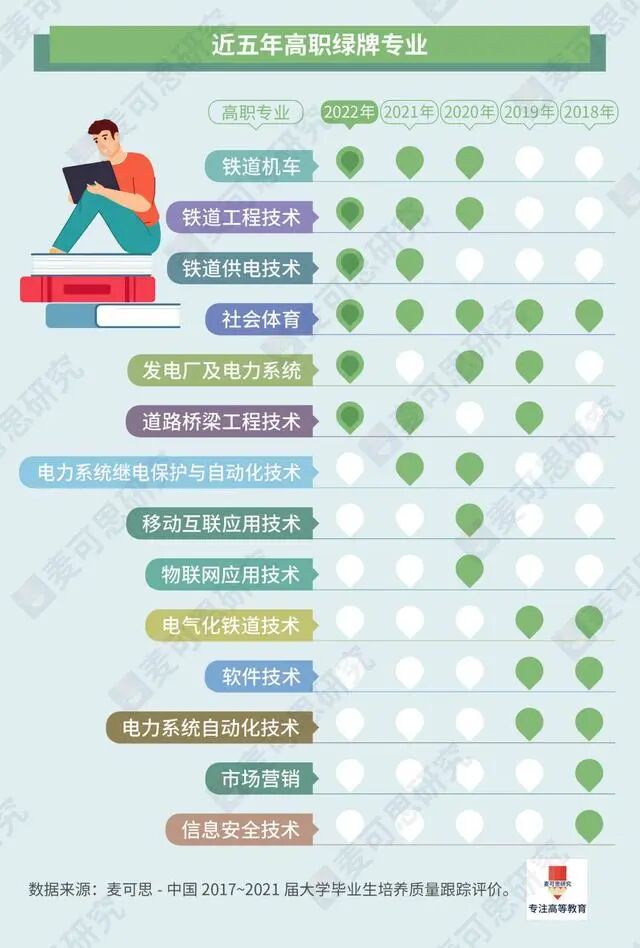 “社会体育”是高职连续五年的绿牌专业,“铁道机车”、“铁道工程技术”、“铁道供电技术”、“发电产及电力系统”和“道路桥梁工程技术”均是2022年高职绿牌专业。