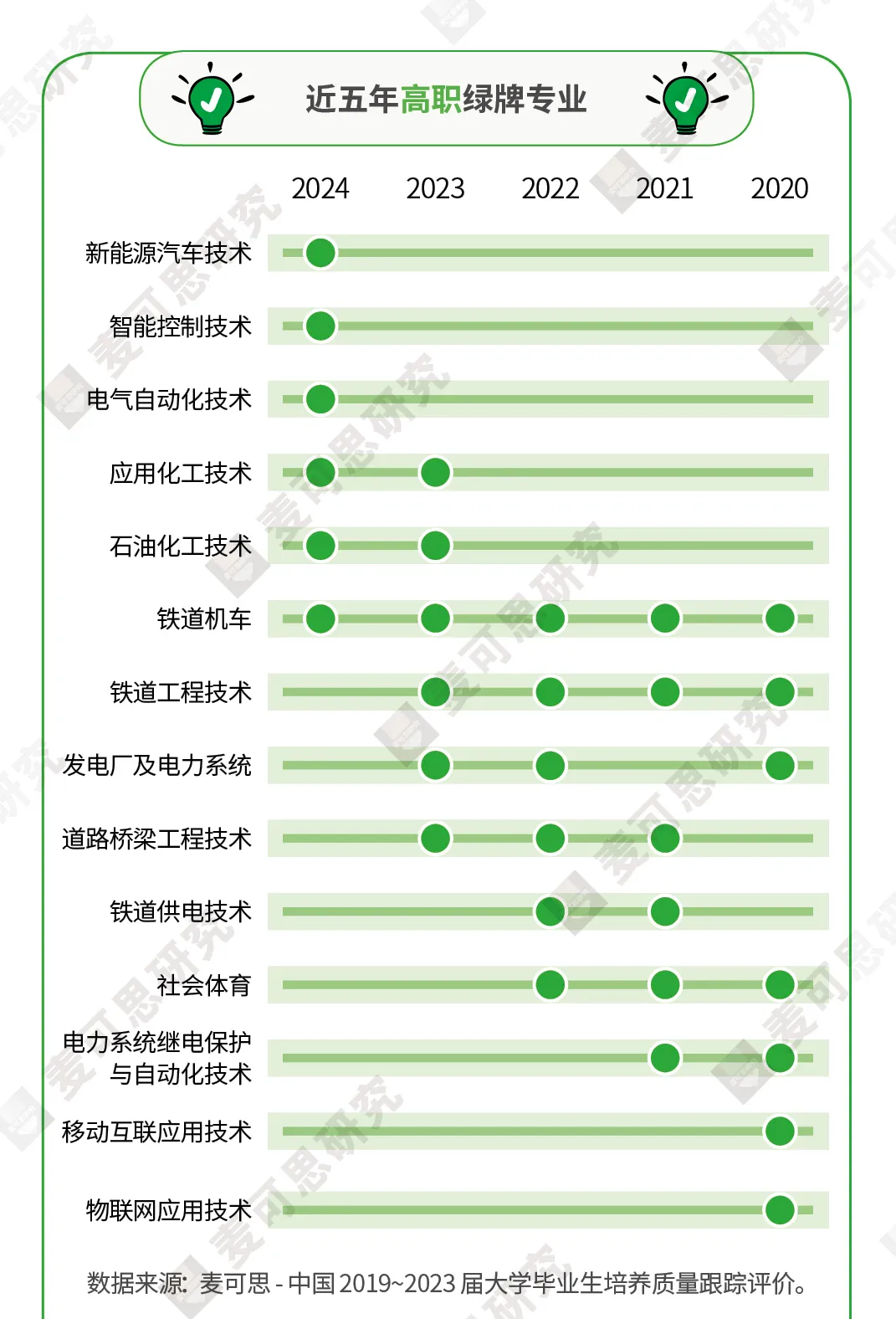 2024年的绿牌高职专业为新能源汽车技术、智能控制技术、电气自动化技术、应用化工技术、石油化工技术、铁道机车。