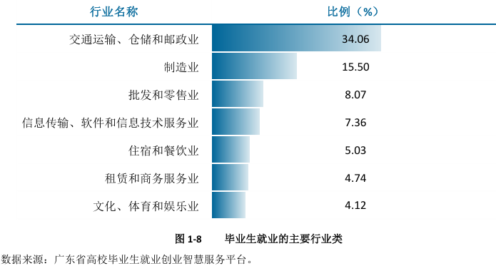 毕业生就业行业特色凸显,以交通运输、仓储和邮政业为主,且职业主要以生产和运输设备操作人员为主。