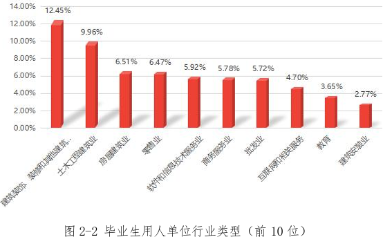在用人单位的行业类型上,最多的是“建筑装饰、装修和其他建筑业”、“土木工程建筑业”、“房屋建筑业”。