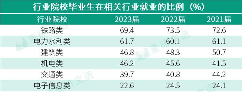 就占比大小而言,铁路类和电力水利类院校毕业生均有超过60%的人在相关行业就业,表明这类院校的专业设置与铁路、电力水利行业的需求高度匹配,使得毕业生能够从事行业相关领域的工作。